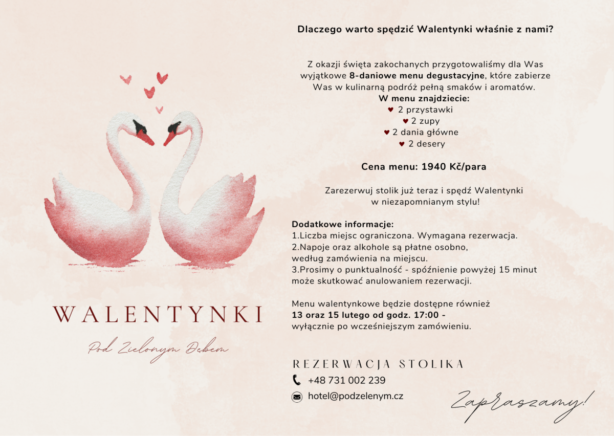 Od godziny 15:00 dostępne wyłącznie menu walentynkowe (1940 Kč/para). Wymagana rezerwacja.